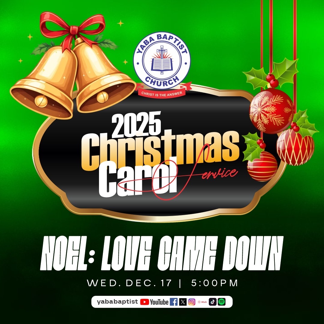 Yaba Baptist Church, Lagos 19/23. Commercial Avenue/Raymond Street, Sabo, Yaba, Lagos Mainland, LagosIt’s the season of joy, hope, and love! 🌟 Celebrate with us at our 2025 Christmas Carol Service. Let’s sing, rejoice, and remember the greatest gift — Jesus Christ. Theme- Noel: Love Came Down | 📍 Yaba Baptist Church 19/23 Commercial Avenue/Raymond Street, Sabo, Yaba, Lagos | 🗓️ Wednesday, December 17th | 5 PM